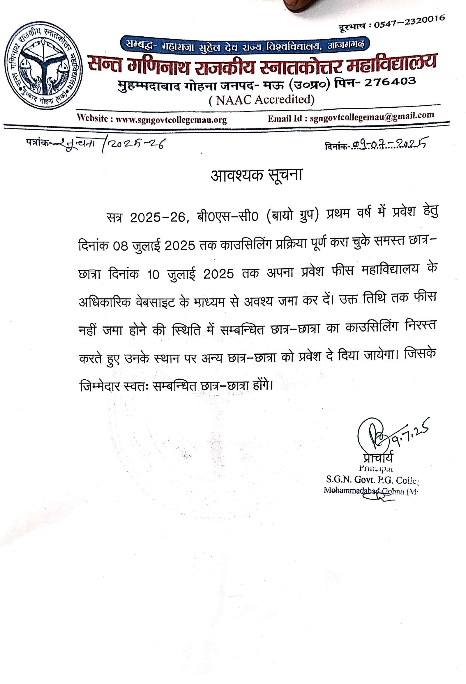 07-09-2025 बी0एस-सी0 प्रथम वर्ष (प्रथम सेमेस्टर) 2025-26 बायो ग्रुप फीस सम्बन्धी सूचना।