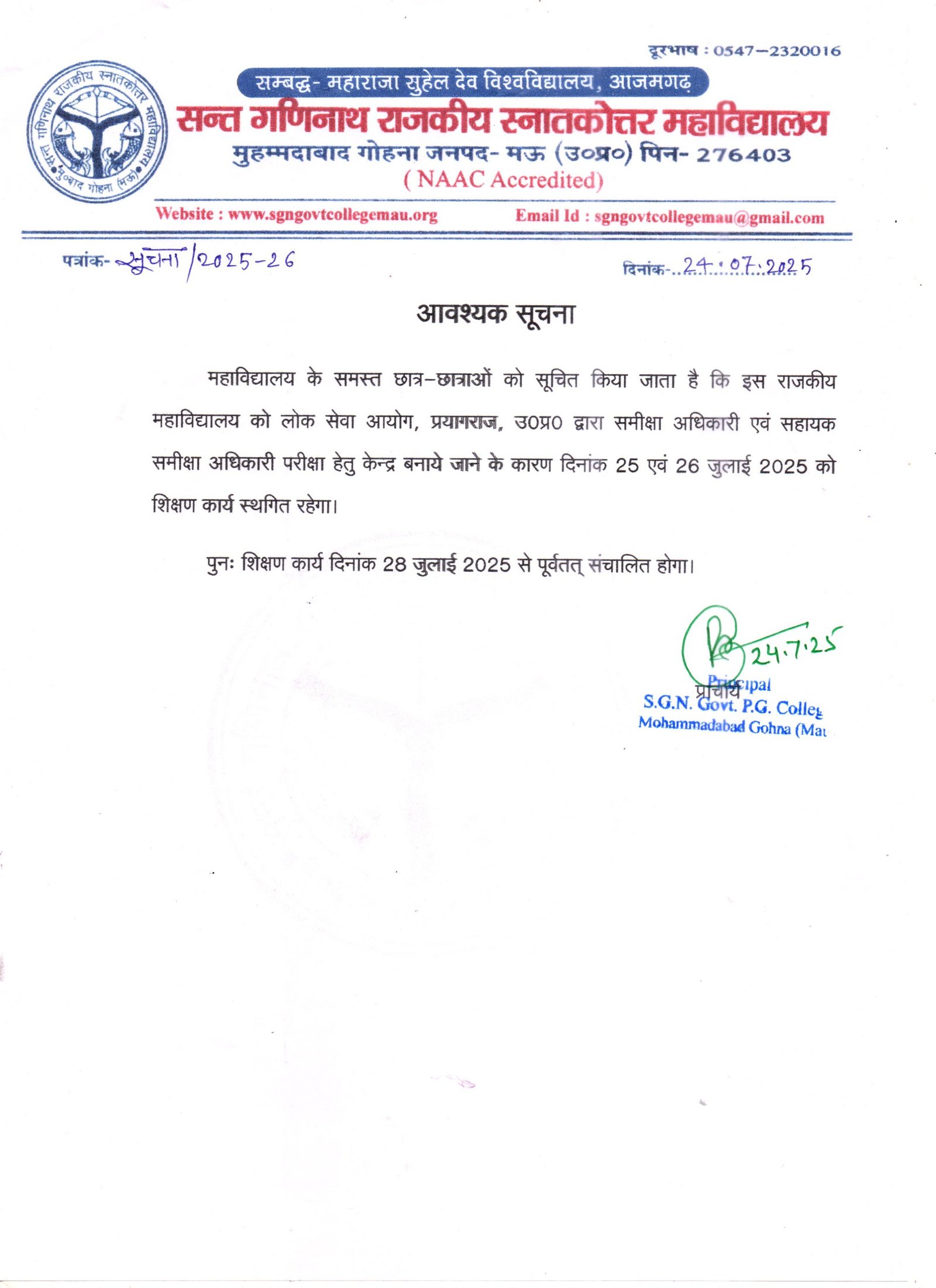 01-09-2021 सत्र 2021-22 में बी0ए0 एवं बी0एस-सी0 के प्रथम वर्ष में प्रवेश के इच्छुक सभी छात्र एवं छात्राओं को सूचित किया जाता है कि दिनांक 04-08-2021 से 10-09-2021 तक महाविद्यालय की अधिकारिक वेबसाइट www.sgngovtcollegemau.org पर छात्र अपना रजिस्ट्रेशन/प्रवेश फार्म आवेदन कर सकते हैं।
