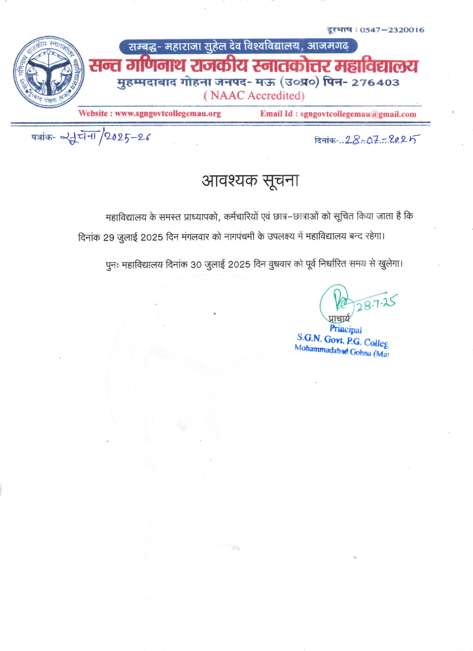 11-01-2022 सन्त गणिनाथ स्नातकोत्तर महाविद्यालय में अध्यनरत बी0ए0/बी0एस0सी0 दितीय वर्ष एवं एम0ए0/ एम0एम0सी0 प्रथम वर्ष के छात्र-छात्राओं को सुचित किया जाता है कि वीर बहादुर सिंह पूर्वाचल विश्वविद्यालय की परीक्षा फॉर्म विश्वविद्यालय की आधिकारिक वेबसाइट से ऑनलाइन भरकर दिनाँक 30 जनवरी तक महाविद्यालय कार्यालय में जमा करना सुनिश्चित करे अन्यथा की स्थिति में छात्र-छात्रा स्वयं जिम्मेदार होंगे।